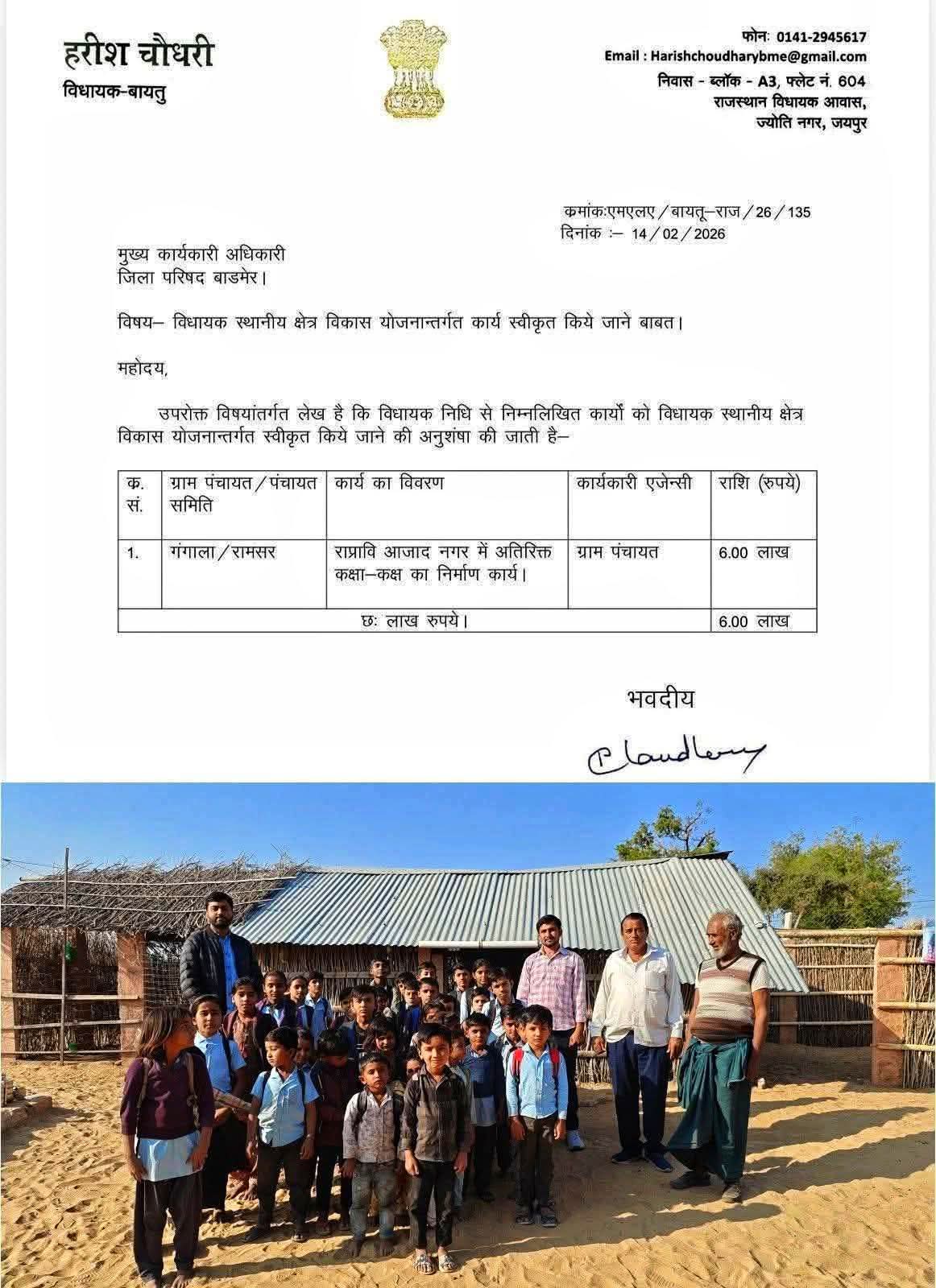 बाड़मेर। बायतु विधायक एवं पूर्व राजस्व मंत्री हरीश चौधरी ने शिक्षा के क्षेत्र में एक महत्वपूर्ण पहल करते हुए शिव विधानसभा क्षेत्र के ग्राम आजाद नगर, गंगाला (रामसर) स्थित राजकीय प्राथमिक विद्यालय में कक्षा कक्ष निर्माण हेतु अपनी विधायक निधि से 6 लाख रुपये की अनुशंसा की है।