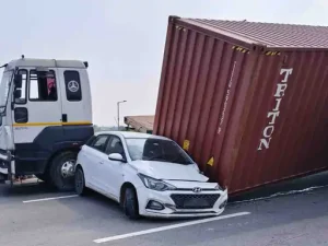 किशनगढ़ में ट्रक से कार पर गिरा कंटेनर:भीलवाड़ा से जयपुर जा रही थी कार, दंपती बाल-बाल बचे, कार क्षतिग्रस्त